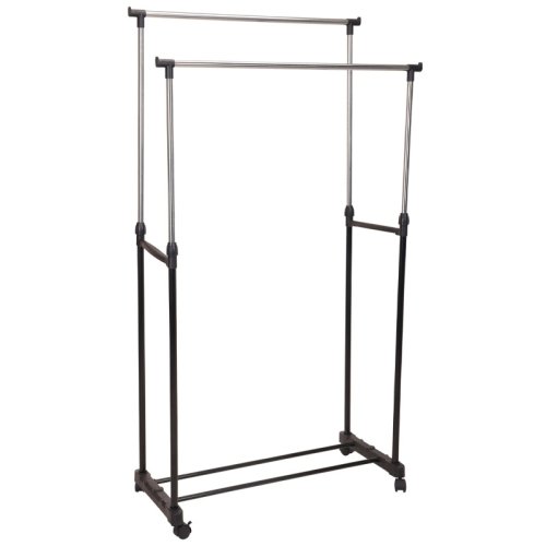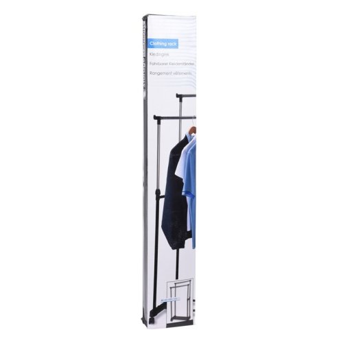 stojan na oděvy na 4 kolečkách, 2 stojany se zesílenou tyčí, kovový rám, horní tyče z nerezové oceli 19 mm. spodní kovové tyče 16mm, tloušťka 0,25mm, černá barva, chromované opperbary, pp díl v černé venkovní barvě. rozměr 80x42xh90-160cm. maximální hmotnost položky je 15 kg. každá položka v naší designové barevné krabičce, když je v 6kusech./ 120x80x765mm, barevná krabice (clb-c): , 800x420x1.650mm / cft 1,73,(8.101/40ft hq).