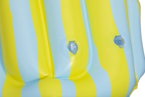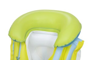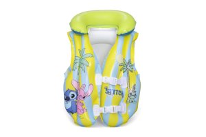 Vesta je vybavena praktickým nafukovacím límcem v jasně zelené barvě, který přidává na komfortu a zároveň pomáhá udržet hlavu dítěte nad hladinou. Celý design vesty je laděný do světlých pastelových barev – žluté a světle modré, které jsou doplněny hravými obrázky Stitche a dalších postaviček z této série. Na přední straně jsou dvě pevné, bílé plastové přezky s nastavitelným zapínáním, které umožňují snadné a bezpečné upevnění vesty na tělo dítěte.