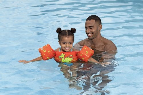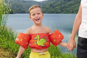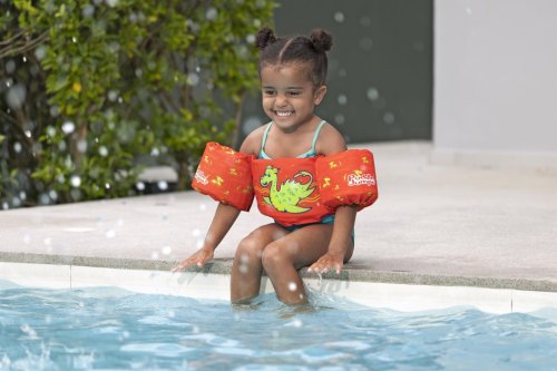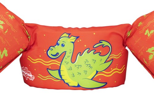 Vesta Monster s rukávky je dětská plavecká vesta navržená pro děti ve věku od 2 do 6 let, která nabízí bezpečnost a pohodlí při pobytu ve vodě. Vesta má výraznou jasně oranžovou barvu a veselý motiv zeleného mořského netvora na přední straně, což zaujme malé plavce a zároveň usnadňuje dohled nad nimi. Vesta je vybavena dvěma nafukovacími rukávky, které zajišťují stabilitu a pomáhají dětem udržet se nad vodou.