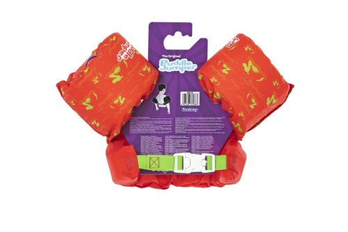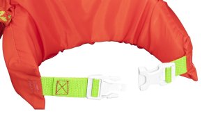 Vesta je opatřena zadní přezkou s nastavitelným zeleným popruhem, který umožňuje snadné a bezpečné upevnění na těle dítěte. Přezka je navržena tak, aby si ji dítě samo nedokázalo rozepnout, což přispívá k jeho bezpečnosti během vodních radovánek. Díky této konstrukci vesta pevně sedí a zajišťuje tak maximální komfort i ochranu během pohybu ve vodě.