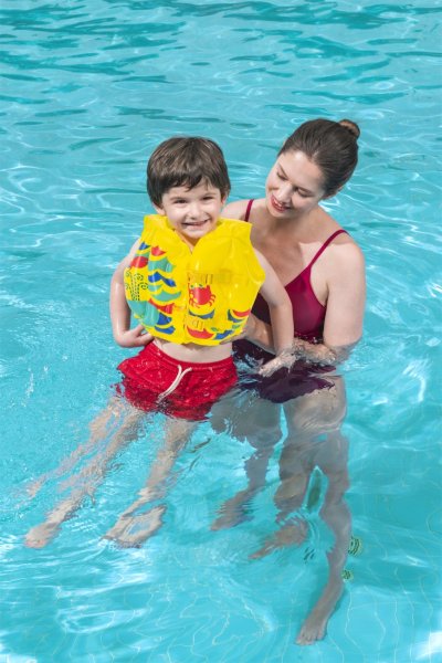 Plovací vesta pro děti od 3 do 6 let o velikosti 41×30 cm. Veselý design, dvě vzduchové komory. Vhodné pro děti o váze 19–30 kg. Dvě přezky na zapínání.