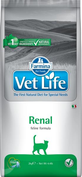 Farmina Vet Life Renal je kompletní dietetické krmivo pro kočky určené pro podporu funkce ledvin v případě chronické nebo dočasné ledvinové nedostatečnosti.