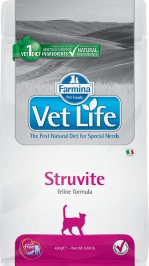 Farmina Vet Life Struvite je kompletní dietetické krmivo pro kočky určené pro rozpouštění a snížení recidivy tvorby struvitových kamenů. Je vhodné také při onemocnění dolních močových cest.