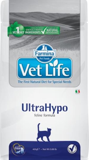 Farmina Vet Life Ultrahypo je kompletní krmivo pro kočky určené pro snížení výskytu potravinových alergií a nesnášenlivostí. Používá se i jako eliminační dieta. Podporuje také funkci kůže v případě kožních poruch a nadměrné ztráty srsti.