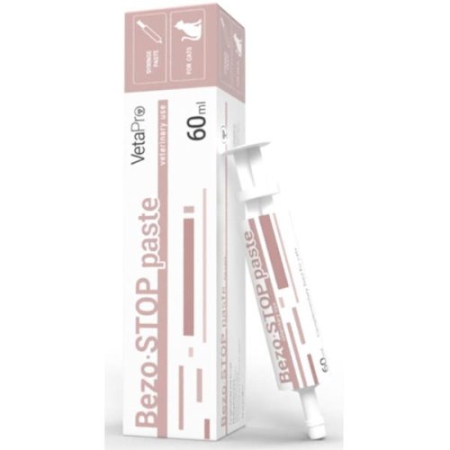 Bezo-Stop Paste je doplňkové krmivo ve stříkačce na bázi oleje určené k odstranění a prevenci tvorby trichobezoárů u koček. Pokrývá žaludek a trávicí (gastrointestinální) trakt olejovou vrstvou v místech, kde cizí tělesa mohou způsobit obstrukci. Preventivní použití se doporučuje u plemen koček s dlouhou srstí (perské) a u koček chovaných v interiéru bez přístupu k hrubým vláknům (trávě), které by vyvolávaly zvracení. Složení: sójový olej*, dextróza, voda, glycerol, oligofruktózový sirup, hovězí želatina, zpracované živočišné bílkoviny (kuřecí), propylenglykol, aroma. *NON-GMO – sójový olej vyrobený z geneticky nemodifikovaných organismů. Emulgátory a stabilizátory: polyoxyethylen (20), sorbitan monooleát (E 433). Návod k použití: pro kočky s tvorbou trichobezoárů: 2 ml denně, pro prevenci: 1 ml denně. Lze podávat přímo do tlamy nebo smíchat s krmivem pro kočky. Atraktivní chuť usnadňuje příjem pasty. Podávání správného množství léku umožňuje praktické kolečko na pístu stříkačky. Otáčejte kolečkem tak dlouho, dokud nebude vpravo od čísla představujícího požadované množství, které má být podáno (viz obrázek níže znázorňující správnou a nesprávnou polohu pro 10 ml). Skladování: Skladujte na chladném a suchém místě mimo dosah přímého slunečního světla. Uchovávejte mimo dosah dětí.