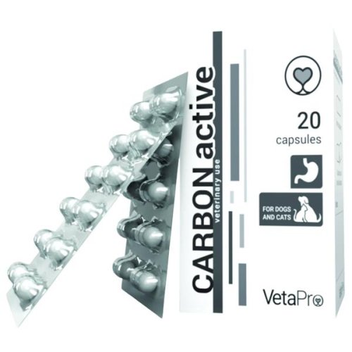 Carbon Active je doplňkové krmivo pro psy a kočky působící jako trávicí adsorbent. Zachovává normální funkci trávicího traktu a napomáhá detoxikaci organismu. Díky rozsáhlému povrchu aktivních částic má aktivní uhlí schopnost absorpce velkého počtu látek organického a neorganického původu a plyny. Z gastrointestinálního traktu se nevstřebává a nepodléhá metabolickému rozkladu, ale spolu s látkami, které absorbuje, se vyloučí z organismu stolicí. Složení: aktivní uhlí 250 mg Doplňkové látky: želatina Návod k použití: psi a kočky: 2–3 kapsle do 20 kg hmotnosti 3–4× denně, nebo podle doporučení veterinárního lékaře. Kapsli lze podat celou přímo na kořen jazyka zvířete nebo ji otevřít a její obsah přimíchat do krmiva. Skladování: Skladujte na chladném a suchém místě, mimo dosah přímého slunečního záření. Uchovávejte mimo dosah dětí. Upozornění: Určeno pouze pro zvířata!