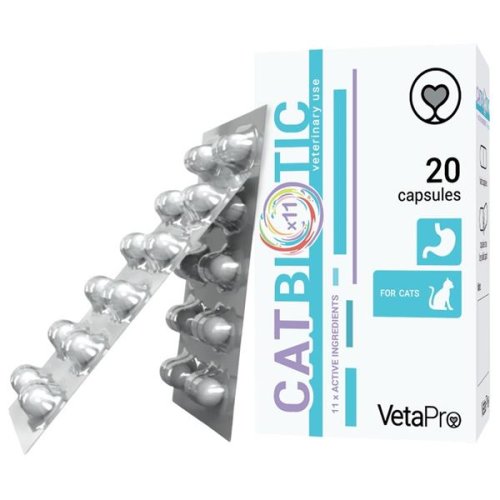 Cat Biotic je doplňkové krmivo pro kočky, které zachovává normální funkce střevní mikroflóry. Synbiotický doplněk probiotik a prebiotik podporuje správnou mikrobiální rovnováhu ve střevech a celkové zdraví trávicího traktu. Složení: frukto-oligosacharidy (FOS), mannan-oligosacharidy (MOS), kyselina máselná, dextróza, pektin, hydrolyzovaný živočišný protein (krůtí a kuřecí maso), stearan hořečnatý, želatinové (hovězí) tvrdé kapsle. Zootechnické doplňkové látky: (4b1705) Enterococcus faecium NCIMB 10415, Bacillus subtilis (4b1823). Technologické doplňkové látky: (E559) kaolin, (551c) křemelina (čištěná rozsivková zemina), (E 551b) koloidní oxid křemičitý. Návod k použití: 1–2 kapsle denně, nebo podle doporučení veterináře. Skladování: Skladujte na chladném a suchém místě, mimo přímé sluneční záření. Uchovávejte mimo dosah dětí. Upozornění: Určeno pouze pro zvířata!
