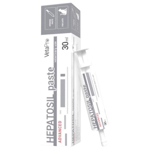 Hepatosil Advance paste je doplňkové krmivo pro kočky, které pomáhá podporovat funkci jater v případě selhání nebo dysfunkce. Regeneruje a chrání hepatocyty, urychluje regeneraci jater a obnovu jejich normální funkce. Složení: dextróza, voda, oligofruktózový sirup, glycerol, sójový olej*, melasa z cukrové řepy, hovězí želatina, zpracovaná živočišná bílkovina (kuřecí a krůtí), aroma. Nutriční doplňkové látky: vitamíny: (3a700) vitamín E. Senzorické doplňkové látky: (2b Silybum marianum) extrakt z ostropestřce mariánského, (2b) suchý extrakt z artyčoku. Aminokyseliny: (3c362) ornitin. Emulgační a stabilizační činidla: polyoxyethylen (20), sorbitan monooleát (E 433). *NON-GMO – sójový olej vyrobený z geneticky nemodifikovaných organismů Dávkování: 1 ml na 5 kg tělesné hmotnosti denně, nebo podle doporučení veterináře. Skladování: Skladujte na chladném a suchém místě, mimo dosah přímého slunečního záření. Uchovávejte mimo dosah dětí. Upozornění: Určeno pouze pro zvířata!