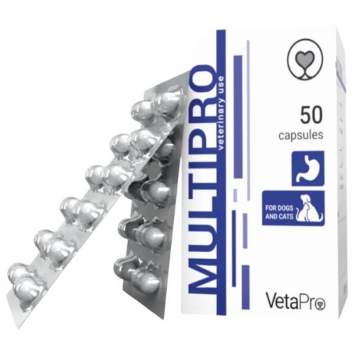 Multipro je nutriční doplněk pro psy a kočky s narušenou střevní rovnováhou trpící akutním průjmem, po dehelmintizaci (odčervení) nebo u štěňat a koťat s řídkými výkaly. Zachovává normální funkci trávicího traktu. Enterococcus faecium nahrazuje „špatné“ bakterie „dobrými“, které přirozeně urychlují zvyšování počtu bakterií působících protizánětlivě v gastrointestinálním traktu. Působí jako inhibitor na různé patogeny. Zastavuje infekční průjmy a průjmy vyvolané antibiotiky a účinkuje proti nim i preventivně. Zlepšuje rovnováhu mikroflóry u všech psů a koček, kteří jsou ve stresu. Podporuje růst dalších zdraví prospěšných bakterií v gastrointestinálním traktu. Bacillus subtilis posiluje imunitní systém psů a koček a pomáhá organismu v boji proti škodlivým bakteriím a virům a spolupůsobí s Enterococcus faecium. Složení: Probiotika: Enterococcus faecium NCIMB 10415 2 × 109 CFU/g, Bacillus subtilis 2 × 109 CFU/g, Prebiotika: frukto-oligosacharidy (FOS) 150 mg/g a mannan-oligosacharidy (MOS) 150 mg/g. Dávkování 1 kapsle denně, nebo podle doporučení veterinárního lékaře. Kapsle lze podat psovi nebo kočce přímo do tlamy na kořen jazyka, nebo kapsli otevřít a její obsah přimíchat do krmiva. Skladování: Skladujte na chladném a suchém místě, mimo dosah přímého slunečního záření. Uchovávejte mimo dosah dětí. Upozornění: Určeno pouze pro zvířata!