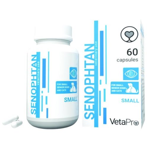 Senophtan Small je nutriční doplněk k podpoře zachování zraku a kognitivních funkcí, který pomáhá starším psům malých plemen a kočkám žít kvalitní život odpovídající jejich věku. Směs taurinu (aminosulfonová kyselina podporující činnost srdce, zdraví očí a funkci imunitního systému), potravinových antioxidantů (vitamín E, vitamín C, lutein, betakaroten, zeaxantin, astaxanthin), mitochondriálního kofaktoru (kyselina alfa-lipoová) a omega-3 mastných kyselin (DHA) pro optimální zdraví mozku a kognitivní funkce. Složení: dextróza (13.2.2), sušené mořské řasy Schizochytrium sp. (7.1.2), kyselina alfa-lipoová (13.6.7), škrob (kukuřičný škrob 13.3.1), sušené rajčatové výlisky (5.35.1), sušená jehněčí játra (9.1.1) 2 %, stearan hořečnatý (13.6.4). Nutriční doplňkové látky na 1 kg: vitamíny: taurin (3a370) (100 000 mg), vitamín E (alfa tokoferol 3a700) (75 000 mg), vitamín C (kyselina L-askorbová 3a300) (75 000 mg), betakaroten (3a160(a)) (5 000 mg). Senzorické doplňkové látky na 1 kg: lutein (2a) (5 000 mg), zeaxanthin (2a) (1 250 mg), astaxanthin (2a) (1 250 mg). Technologické doplňkové látky: (E460) MCC; (1g568) klinoptilolit, (E 551b) koloidní oxid křemičitý. Dávkování: psi a kočky: 1 tableta denně pro zvířata o hmotnosti do 5 kg, nebo dle doporučení veterinárního lékaře. Vložte tabletu přímo a hluboko do hrdla psa, nebo tabletu rozdrťte a smíchejte s potravou. Skladování: Skladujte na chladném a suchém místě, mimo dosah přímého slunečního záření. Uchovávejte mimo dosah dětí. Upozornění: Určeno pouze pro zvířata!
