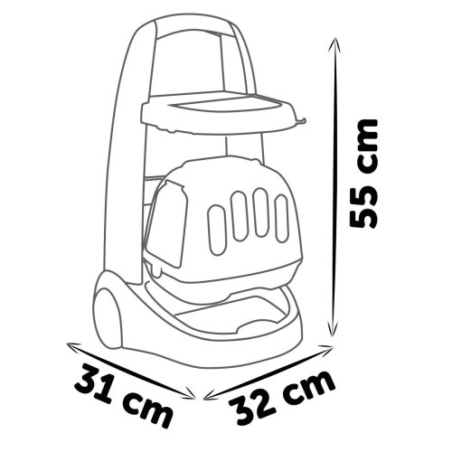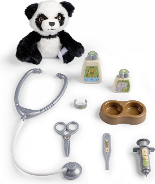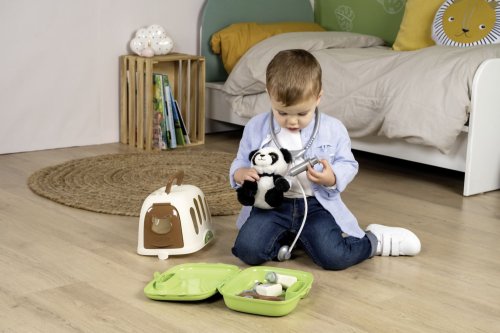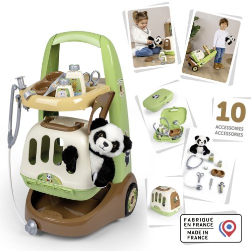 Veterinární vozík s měkkým plyšovým zvířátkem, přepravním boxem 2 v 1 s odnímatelným mobilním lékařským kufrem a spoustou příslušenství. Díky kolečkům s lehkým chodem je mobilní lékařský vozík ovladatelný a lze jej snadno řídit. Příslušenství obsahuje vše, co skutečný veterinář potřebuje k léčbě svých čtyřnohých pacientů: stetoskop, injekční stříkačku, nůžky, misku s krmivem pro zvířata, náramek a dvě lahvičky (šampon nebo lék). Roztomilá panda doplňuje tuto hravou sadu pro veterináře, stejně jako skvělý kufr 2 v 1, který lze použít jako přepravní box pro zvířátka i jako pojízdný kufřík pro veterináře, který lze používat i samostatně. K tomu lze pouzdro z horní části jednoduše odepnout a veškeré příslušenství lze snadno umístit dovnitř pouzdra. Rozměry produktu (DxŠxV): 31 x 32,1 x 55,2 cm.