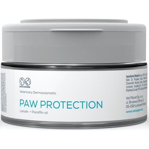 Paw Protection pečující a ochranná mast pro psy a kočky je přípravek určený k péči o choulostivé tlapky zvířete. Chrání během procházek v obtížných povětrnostních podmínkách (jako je mráz nebo teplo) a okolních podmínkách (např. přítomnost štěrku nebo soli v zemi). Díky oleji z čajovníku má mast hořkou chuť, která odrazuje od lízání a umožňuje ji použít k odstranění obvyklého lízání nebo kousání srsti.