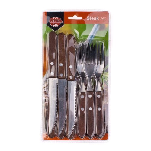 12 dílný steakový set využijete při servírování grilovaných jídel. Materiál sady: nerez / dřevo. Síla čepele nože: 1,2 mm / vidlička 1,5 mm. Povrchová úprava čepele: lesk. Celková délka nože je 20,6 cm, délka čepele: 11,5 cm, síla držadla 0,9 cm. Celková délka vidličky se 4 hroty: 18,7 cm, délka čepele: 9,6 cm, síla držadla 0,9 cm. Složení sady: 6x vidlička a 6x nůž