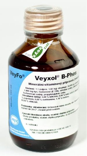 Emulze na minerální bázi obsahující fosfor a vitamín B12. Veyxol B-Phos 100ml z kategorie Vitamíny pro hospodářská zvířata Veyx . Emulze na minerální bázi obsahující fosfor a vitamín B12. Doplnění výživové potřeby organismu. Podává se v období zvýšené zátěže (porod, transport, teplotní výkyvy).