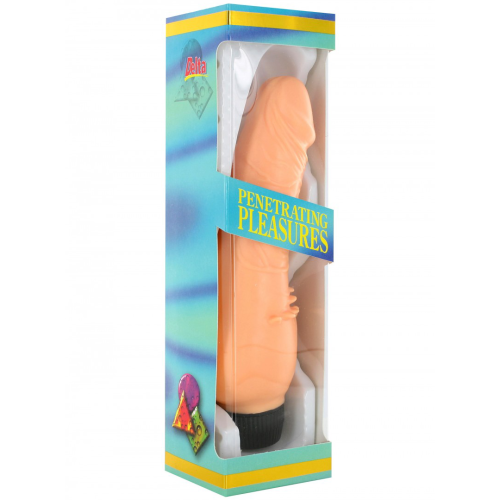 Vibrátor tělové barvy, který je mírně zahnutý a má na spodní straně malé výstupky.