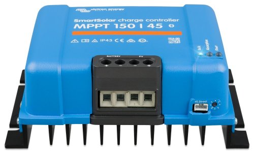 Robustní a rychlý MPPT regulátor pro náročné podmínky s napětím panelů až 150 V, maximální nabíjecí proud 45 A. Baterie 12/24/48 V, FV max. 650/1300/2600 Wp. Vestavěné Bluetooth a VE.direct rozhraní.