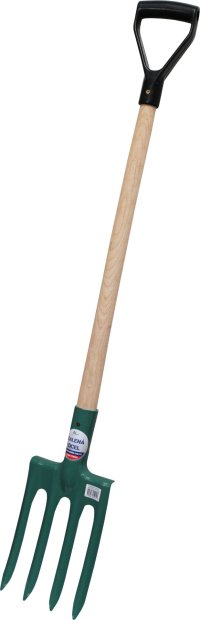 Zelené komaxitové rycí vidle - kalená ocel. S dřevěnou násadou a umělohmotným držadlem.