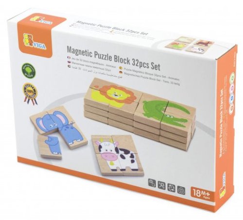 Osm skládaček se zvířátky vyrobených z vysoce kvalitního dřeva. 32 čtverečků je opatřeno magnetickou vrstvou, která umožňuje skládání a následné hraní na lednici, magnetické tabuli či jiném kovovém povrchu. Součástí výrobku je i látkový pytlík. Skládáním puzzle si děti procvičují logiku, představivost, koordinaci oko - ruka. Rozměr jednoho dílku je 4x4x1 cm. Vhodné pro děti od 18 měsíců. Rozměr složeného puzzle cca 8 x 8 cm
