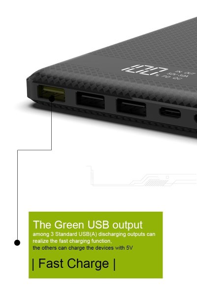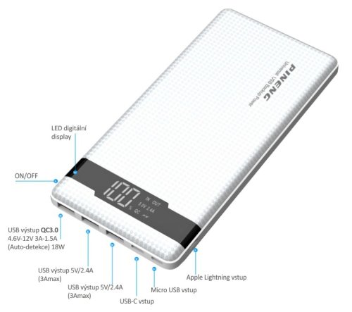 Klíčové vlastnosti: • Kapacita baterie 20000mAh (74Wh) • Podpora rychlého nabíjení (USB-C Power Delivery a Qualcomm Quick Charge 4.0+) • 3x USB-A a 1x USB-C výstup • USB-C, Apple Lightning i Micro USB vstup pro flexibilní možnosti dobíjení powerbanky • Automatická detekce připojeného zařízení díky MCU čipu • Inteligentní ochrana proti přepětí, přehřátí a přebití • LED indikátor ukazuje stav nabití baterie • Elegantní a odolné provedení díky tenkému kovovému tělu • Kompaktní rozměry a nízká hmotnost – ideální na cesty i každodenní použití • Vhodná pro nabíjení mobilních telefonů, sluchátek, chytrých hodinek a dalších zařízení