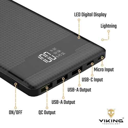 Powerbanka Viking PN-962PD 20000 mAh • Kapacita: 20000mAh/74Wh • Maximální výkon: 22,5W • Rychlé nabíjení PD 3.0 a QC 4.0+ • Široká škála vstupů a výstupů (USB-A, USB-C, Micro USB, Apple Lightning) • Vestavěný inteligentní čip (MCU) • LED display