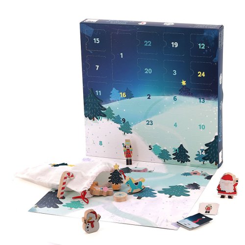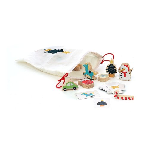 Adventní kalendář, který uvnitř skrývá hru hmatej a najdi! V každém z 24 okének děti najdou dřevěný dílek nebo papírovou kartičku, nechybí ani textilní pytlík. Po otevření celého kalendáře si děti konečně mohou užít hru hmatej a najdi ve vánočním designu.Hmatej a najdi je nepřekonaný bestseller Vilac. Originálním způsobem se snaží rozvíjet často opomíjený smysl dětí, hmat. Hra je tvořená zejména dřevěnými figurkami ukrytými v látkovém pytlíku. Menší děti mají za úkol po vložení ruky do pytlíku jen na základě hmatání popsat svými slovy, jaký předmět drží v ruce. Rodiče mohou postup dětem předvést názorným příkladem. Starší děti mohou hrát hru ve formě lota, nebo binga, k těmto hrám jsou v sadě k dispozici obrázkové karty jednotlivých předmětů. V balení 21 dřevěných dílků, 20 papírových karet, textilní pytlík. Hlavní vlastnosti: 21 dřevěných dílků a 20 obrázkových karetpro 2–5 hráčůrůzné herní variantypraktické balení Návod ke hře:Hmatej a najdi:První hráč si vezme kartu z hromádky. Poté musí sáhnout do pytlíku a podle hmatu najít dřevěný dílek, který odpovídá obrázku na kartě. Pokud vybere správný dílek, kartu si ponechá a na řadě je další hráč, který opět začíná tažením karty z hromádky. Pokud ale první hráč vybere nesprávný dílek, musí svou kartu předat dalšímu hráči, který se musí pokusit najít správný dílek. Po každém kole se dílky vrací zpět do pytlíku. Když už na hromádce nezbývá žádná karta, určí se vítěz. Vítězí hráč s největším počtem karet. Pozor! Pokud jeden z hráčů náhodou vytáhne dílek ve tvaru cesmíny, musí všechny své karty vrátit na hromádku! Pravidla můžete upravit dle vlastního uvážení, aby se děti lépe seznámily s hmatáním a hledáním předmětů: 1 – Začněte s malým množstvím dřevěných dílků.2 – Dovolte dětem podívat se do sáčku.3 – Poté hru opět udělejte o něco těžší, nedovolte jim nahlížet do sáčku.4 – Přidejte do sáčku více dílků.5 – Nakonec, až si děti na hru zvyknou, hrajte podle tradičních pravidel. BINGO varianta:Rozložte 4 karty do čtverce a vytvořte jedno nebo více hracích polí pro každého hráče. Jeden z hráčů nebo rodič vytáhne dílek ze sáčku a vyvolá ho. Hráč, který má kartu odpovídající tomuto vyvolanému dílku, si jej vezme a položí na svou kartičku. Vítězí hráč, který jako první zaplní své herní pole!