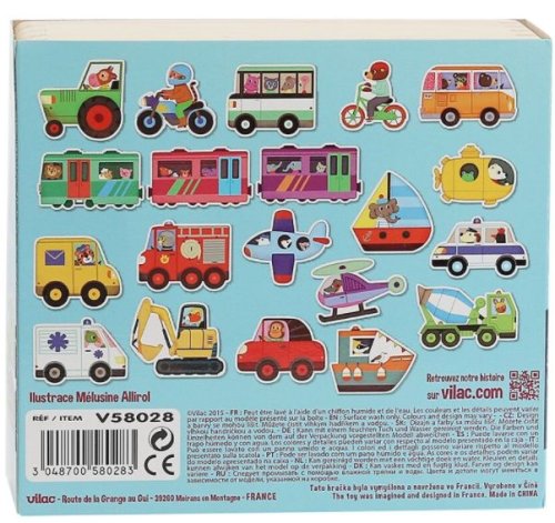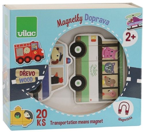 Sada dvaceti dřevěných magnetů s motivy dopravních prostředků. Rozměry balení: 15 x 14 x 6 cm Rozměry autobusu: cca. 7 x 8 cm Věk: 2+ Materiál: dřevo, magnet Obsahuje 20 ks