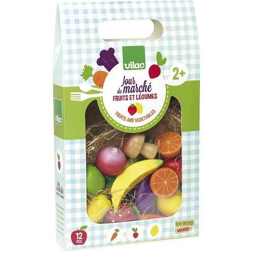 Sada ovoce a zeleniny, s kterou si děti mohou hrát na malé obchodníky na trhu. Pěkná lepenková krabice obsahuje mrkev, citron, ředkvičku, pórek, lilek, žampion, rajče, banán, jablko, hrušku, jahodu a dvě poloviny pomeranče. Ovoce je dřevěné s plstěnými doplňky. Hlavní vlastnosti: vhodné do každé kuchyňkypotraviny vyrobené ze dřevaobsahuje 12 ks