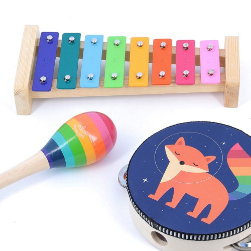 Nechť hudba zní! Souprava pestrobarevných perkusních nástrojů zdobených motivy výtvarníka Andyho Westface. Skládá se z xylofonu, tamburíny, trianglu a maracas. Jejich prostřednictvím mohou děti budovat svůj vztah k hudbě, cit pro rytmus i melodii. Hrou s nástroji lze rozvíjet jemnou motoriku, prohlubovat fantazii a kreativní dovednosti. Díky kombinaci kovu a dřeva jsou pevné, odolné a mohou nabídnout dlouhou životnost. Hlavní vlastnosti: xylofon s paličkou, triangl, tamburína a maracasdesign Andy Westfacepevné a odolné provedení Andy Westface je ilustrátor žijící a působící v Hongkongu. Svou prací se snaží zprostředkovat silné pocity a jasné myšlenky za pomoci jednoduchých tvarů, kompozic i barevnosti. Typickými prvky jeho děl jsou zvířata a duha, které si oblíbil pro jejich čistotu, upřímnost a schopnost vzbuzovat radost.