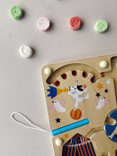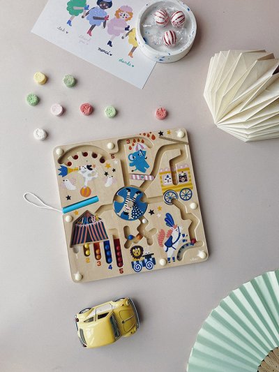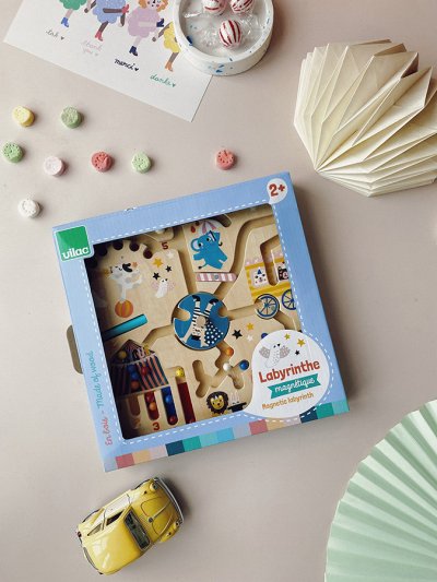 Tento magnetický labyrint s motivem cirkusu s krásnými ilustracemi Michelle Carlslund je určen pro ty nejmenší, aby probudil jejich smysly. Děti vybavené kouzelným perem nechají kuličky cestovat labyrintem, aby se setkaly se žonglujícím psem a jeho dvěma holubicemi, elegantním panem akrobatem a také kouzelným lvem a králíkem... Ale kdo to sestupuje z nebe, za pomoci deštníku? Je to neuvěřitelné, létající slon! Zaklepejte na dveře přívěsu dvou klaunských medvědů, kteří vám prozradí tajemství klisny akrobatky! Přehlídka skončila, nyní musíte dát každý z barevných míčků zpět na správné místo: 1 bílý, 2 žluté, 3 růžové, atd... orientujte se podle číselné nápovědy! Tato hra trénuje motoriku dětí a rozvíjí jejich smysly. Hlavní vlastnosti: rozvíjí motorické dovednosti dětí procvičuje jednoduché počítání zábavnou formoudesign Michelle Carlslund Cestujte s námi v naivním a elegantním světě dánské ilustrátorky Michelle Carlslund, světě jemných barev, který je plný roztomilých medvědů a přátelských ptáčků. V roce 2010, když Michelle ještě studovala grafický design, vytiskla doma své ilustrace a zkusila je prodat na designovém trhu, kde se setkaly s velkým úspěchem! Několik obchůdků chtělo začít prodávat její výtvory, a tak ji napadlo, že by bylo fajn začít podnikat. Michelle se rychle stala uznávanou nezávislou ilustrátorkou. Dnes lze její ekologická grafická díla zakoupit po celém světě v designových buticích, papírnictvích a dětských obchodech. Michelle se inspiruje vším kolem ní. Její výtvory jsou něžné a poetické, stylizovaný a dětinský styl, který se perfektně prolíná s hračkami firmy Vilac. „Jsem hranolky milující, časová optimistka a tvůrkyně ekologických plakátů a ilustrátorka na volné noze se sídlem v dánské Kodani,“ to by řekla ilustrátorka Michelle Carlslundová, kdyby se měla popsat jednou větou.