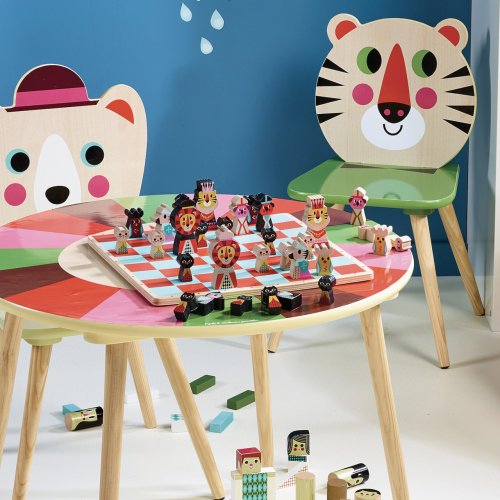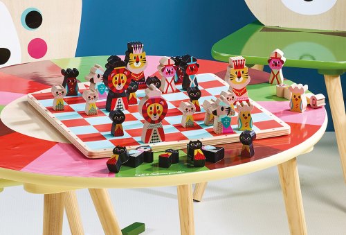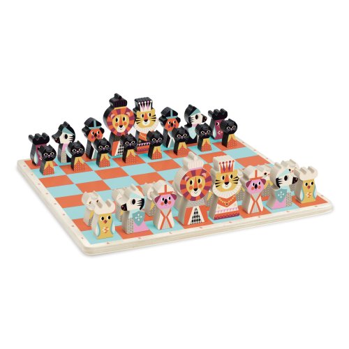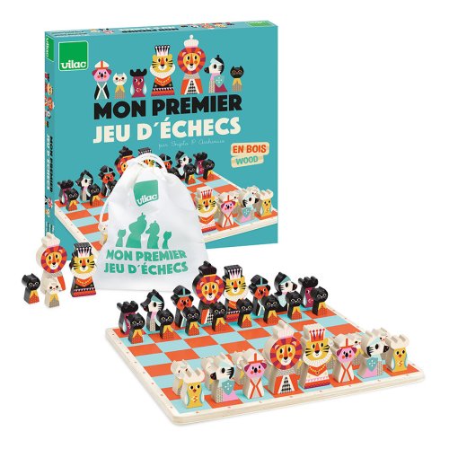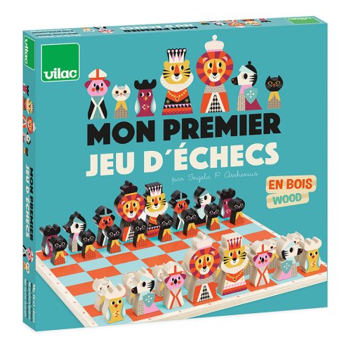 Barevné šachy pro nejmenší s dřevěnými figurkami zvířat. Lehce upoutají pozornost dětí a ty si tak snadněji osvojí princip hry. Figurky jsou uloženy v látkovém pytlíku. Balení obsahuje 32 dílků. Ilustrováno Ingelou P. Arrhenius. Hlavní vlastnosti: dřevěná herní deska i figurkybarevná hra stimuluje smysly dětídesign Ingelou P. Arrhenius Návod hryObsah hry: herní plán16 černých a 16 bílých šachových figurekbavlněný pytlík Dva hráči, "černý" a "bílý" mají vedle svého krále 15 dalších figurek: dámu, 2 střelce, 2 jezdce, 2 věže a 8 pěšců. Startovní pozice:Na začátku hry se dílky rozestaví jako na obrázku č. 1, který naleznete v originálním návodu v balení.Král vždy stojí na poli E, královna na poli D. Začíná bílý hráč, poté se hráči na tahu střídají po jednom tahu. Hráč se nikdy nemůže svého tahu vzdát. Žádným tahem se figurka nesmí přesunout na políčko, na kterém již stojí jiná figurka stejné barvy. Figurky se pohybují vždy na prázdná místa, výjimkou je jen braní soupeřovy figurky. V tomto případě hráč postaví svou figurku na místo vzaté figurky soupeře. Jezdec je jediná figurka, která může přeskakovat ostatní figurky.Braní soupeřovy figurky spočívá v tom, že se tato figurka odstraní políčka a na stejné políčko se postaví figurka, která ji vzala.Cílem hry je dát šach-mat králi oponenta.Šach nastává, když nějakým tahem napadnete soupeřova krále, tzn. přesunete figurku tak, že by potenciálně příštím tahem mohla krále brát, tomuto se říká šach. Pokud taková situace nastane, je soupeř povinen hrát tak, aby tuto hrozbu odvrátil. Např. táhnout králem na políčko, které není napadeno nebo před krále postavit jinou figurku a tím odvrátit útok nebo napadající kámen sebrat.Pokud neexistuje žádný tah, který by vyhovoval pravidlům, znamená to mat neboli šach-mat, tzn. konec hry a vítězství hráče, který dal mat. Podle pravidel se figurka krále nedá vzít, při šach-matu se proto pokládá ležmo na hrací desku. Jak se pohybují jednotlivé dílky:Hra je zajímavá tím, že se každá figurka pohybuje jinak. KrálMůže se pohybovat o jedno políčko do všech směrů, samozřejmě ne na políčka, která jsou ohrožována figurkami spoluhráče. Dva králové nikdy nemohou být na sousedních polích. Cílem hry je dát šach králi protihráče. Král nemůže být nikdy vzatý. Pokud některý hráč napadá oponentova krále, musí ho upozornit vyřknutím slova “šach”. DámaJe nejsilnější figurkou, protože se může pohybovat do všech stran, o libovolný počet polí. Nesmí při tom ale přeskočit jinou figurku. JezdecJezdec se nepohybuje v přímce, jako ostatní figurky, ale z jednoho políčka na druhé, ve tvaru písmena L. Může přeskakovat vlastní i oponentovy figurky. Při pohybu se nejprve posune o dvě políčka dopředu, dozadu, doleva nebo doprava a poté o jedno políčko doleva, doprava, nahoru nebo dolů, aby tak okopíroval svým pohybem písmeno L. Nikdy však diagonálně. Viz obrázek v návodu. StřelecPohybuje se a bere figurky v diagonálách. Může se pohybovat o kolik polí chce, ale při každém tahu jen v jednom směru. Nesmí přeskakovat figurky. Z pohybu po diagonálách vyplývá, že žádným tahem nelze změnit barvu políčka, na kterém střelec stojí. VěžPohybuje se horizontálně a vertikálně v jakékoliv vzdálenosti. Ze svého políčka se může přesunout na takové, které je buď ve stejné řadě nebo stejném sloupci. Nesmí však přeskočit žádnou figurku, která by stála v cestě. PěšecPohybuje se o jedno políčko vpřed, kromě prvního tahu, kdy se může, pokud chce, posunout o dvě políčka vpřed. Pěšec se pohybuje pouze vertikálně, výjimkou je braní soupeřových figurek, tehdy se pohybuje diagonálně, jako střelec. Vždy však o jedno políčko. Jakmile se pěšec dostane na 8. políčko – soupeřovu základnu, musí se "proměnit" v jinou figurku, dle rozhodnutí hráče, a to v takovou figurku, která byla vzata soupeřem. Královna je nejlepší volbou, pokud již byla vzata. Švédská umělkyně Ingela Peterson Arrhenius se narodila v roce 1967. Umění a design měly vždy místo v jejím životě a než začala její kariéra ilustrátorky, Ingela pracovala jako umělecká vedoucí ve Stockholmu. Poté studovala reklamní a grafický design na umělecké škole také ve Stockholmu. V roce 1992 začala podnikat jako ilustrátorka na volné noze a pracovala mezinárodně napříč reklamou, designem, nakladatelstvím… V minulosti vytvářela tiskové vzory pro tkaniny, tapety, papírnictví, také pracovala na obalech, produktovém designu, bytových doplňcích a hračkách. Její plakáty a designové hračky najdete po celém světě. Má vášeň pro retro styl, což je jasně vidět na jejich dílech a také v jejím nadšení pro typografii a barvy. Nyní žije ve Stockholmu s manželem a 2 syny.