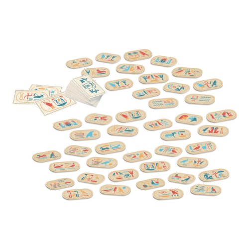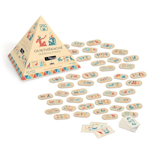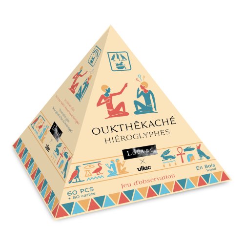 Vydejte se na cestu časem a objevujte starověký Egypt pomocí pexesa s hieroglyfy, které bylo inspirováno expozicí egyptských památek muzea Louvre. Při hře se vylosuje kartička a otočí tak, aby ji všichni viděli. Hráči se přitom snaží co nejrychleji najít a sebrat dílek se shodnými znaky. Ale pozor, nesmí polevit v pozornosti, protože velký faraon si na ně připravil několik pastí! Herní dílky jsou pevné a odolné, vyrobené ze dřeva. Dodáváno v atraktivně dekorované krabici ve tvaru pyramidy. Hlavní vlastnosti: 60 herních dílků a 60 karetjedinečný design a zpracovánípraktické balení Zkrácený návod hry:Rozložte všechny herní dílky doprostřed stolu, lícem nahoru. Karty zamíchejte a položte na hromádku, také doprostřed stolu.Hráč si vezme z hromádky kartu a ukáže ji protihráčům. Kartu si ponechá hráč, který najde na stole odpovídající dílek jako první.Vítězí hráč, který jako první získal 10 karet. Umění hry, to je kolekce Vilac x Louvre. Klasická i méně známá díla, stálé i dočasné expozice Egypta nebo Řecka, řada Louvre bude každý rok doplněna o novou tvorbu, ve spolupráci s muzejními specialisty. Děti se mohou o obrazovém umění a velkolepých sochách z nejnavštěvovanějšího muzea na světe naučit nové poznatky hravým způsobem!