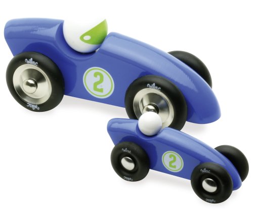 Modré závodní auto speciálního designu, vyrobeno z lakovaného dřeva s kovovými pogumovanými koly. Je vhodné jak ke hraní tak jako dekorace do pokojů dětí či dospělých. Vyrobeno ve Francii. Hlavní vlastnosti: vyrobeno ve Francii