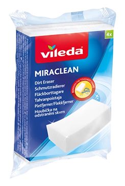 Houba na mytí většiny tvrdých povrchů např. v kuchyni a v koupelně. Vileda Miraclean houbička snadno odstraňuje skvrny (čaj, káva, vodní kámen, značky od pera apod.) z většiny tvrdých povrchů. Čistí pouze vodou.