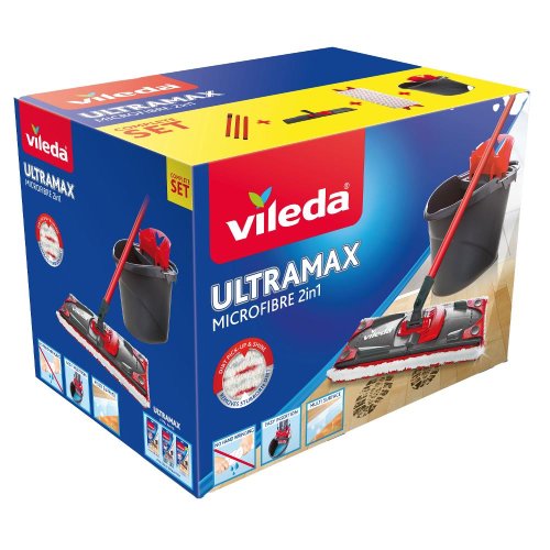 Set v krabici obsahuje Ultramax mop a kýbl se ždímacím košem Vhodný pro všechny typy podlah - PVC, plovoucí podlahy, parkety, dlažba Zcela nová technologie ždímání power press Unikátní systém lamel snižuje námahu při ždímání o 30%.