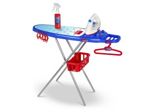 Žehlící prkno s žehličkou Vileda s mnoha doplňky – součástí balení je žehlící prkno, žehlička, kropítko, ramínka, košík a věšák na prádlo.