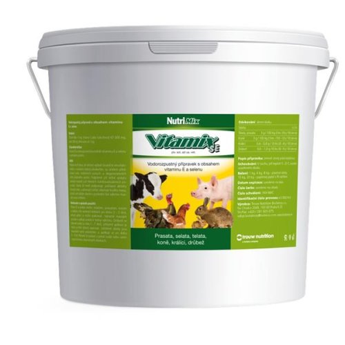 Problém: V České republice je dlouhodobě pozorována nízká hladina selenu v krmných surovinách, což v kombinaci s intenzivním růstem nebo vysokou užitkovostí zvyšuje nároky na jeho doplnění do krmné dávky. Složení v 1 kg: selen 300 mg, vitamin E 67 000 mg. Způsob aplikace: Přípravek je určen k aplikaci do pitné vody, případně i k zamíchání přímo do krmiva. Nejprve se denní dávka rozpustí v menším množství vody v poměru přibližně 1 : 10 a dále se tento roztok přidává do napáječek nebo do zásobníku vody. Při podávání v krmivu je nutné dávku rovnoměrně zamíchat. Vitamix SE se podává selatům, telatům, prasatům, koním a králíkům v níže uvedených dávkách po dobu 3 – 5 dnů. Výrazně masným prasatům poslední 2 týdny výkrmu. Drůbeži se přípravek podává po dobu 5 – 7 dnů, přičemž aplikaci je možné po 3 týdnech opakovat. Dávkování: