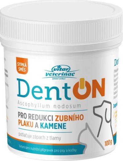 Veterinární nutriční doplněk pro redukci zubního plaku a kamene u psů a koček. Přírodní přípravek obsahuje mořskou řasu Ascophyllum nodosum pro redukci zubního plaku a kamene, navíc výrazně snižuje zápach z tlamy u psů a koček. Preparát působí přímo v zažívacím traktu zvířete, odkud se následně dostává do krevního řečiště, poté do slin a tím velmi účinně působí na zuby a dásně. Významně ovlivňuje schopnost zachycování bakterií způsobujících zubní plak a změkčuje existující zubní kámen, který většinou sám odpadne nebo je velmi snadno odstranitelný. Přípravek ve formě sypké směsi neobsahuje umělá barviva, lepek a cukr. Bez genetických modifikací. Složení: Ascophyllum nodosum Doporučené dávkování: 400 mg 1 odměrka (je součástí balení) Denní dávkování: Malá plemena psů do 10 kg a kočky ½ odměrky. Psi od 10 kg do 25 kg 1 odměrka. Psi od 25 kg 2 odměrky. Způsob použití: 1x denně přimíchejte do běžné stravy vašeho zvířete. Přípravek používejte pravidelně. Pokud se výsledky neprojeví do 4-8 týdnů zdvojnásobte denní dávku.