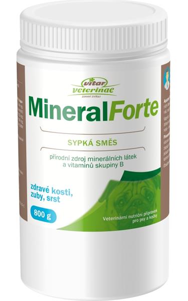 Nomaad Mineral Forte je veterinární nutriční přípravek na podporu zdravého růstu kostí, zubů a srsti u psů a koček. Sypká směs ve složení Aquaminu F a pivovarských kvasnic. Aquamin F – přírodní zdroj minerální látek vyráběných z vápenatých mořských řas. Mořské řasy jsou získávány z mořského dna Severního Atlantiku, z čistých, neznečištěných minerálně bohatých vod. Obsahuje bioaktivní vápník, hořčík a dalších 74 minerálních látek a stopových prvků, např. fosfor, železo, molybden, zinek, nikl, měď a další. Vápník je základním stavební složkou kostí, je nezbytný pro jejich zdravý vývoj, ale také v pozdějším věku zvířete pro udržení jejich pevnosti. Pivovarské kvasnice jsou jedním z nejbohatších přírodních zdrojů vitaminů skupiny B a některých minerálních látek. Obsažené látky zlepšují chuť k jídlu, vitalitu, kvalitu kůže a srsti. Navíc působí proti průjmově. Dále mají příznivý vliv na reprodukci, jsou ideální pro kojící samice a správný vývin štěňat a koťat. Obsažené látky ve výrobku jsou z čistě přírodních zdrojů. Složení: Aquamin F (mořský multiminerální komplex), pivovarské kvasnice (směs vitaminů a minerálních látek). Aktivní složky ve 4 g (vrchovatá čajová lžička): Aquamin F 2 000 mg obsahuje: vápník 32 % (640 mg), hořčík 2,2 % (44 mg). Pivovarské kvasnice 2 000 mg obsahují: vitamin B1 0,14 mg, vitamin B2 0,064 mg, vitamin B6 0,032 mg, vitamin B12 0,042 µg, kyselina pantothenová 0,06 mg, kyselina listová 16 µg, niacin 0,86 mg, vápník 5,6 mg, draslík 36 mg, fosfor 22 mg, železo 0,14 mg, měď 10 µg, mangan 14 µg, zinek 0,1 mg. Doporučené dávkování: 4 g na 10 kg hmotnosti zvířete. Přidávejte k běžné stravě zvířete, případně rozmíchejte ve vodě a podávejte jako součást pitného režimu.