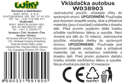 Vkládačka autobus. Velikost 15cm. 8 vkládacích tvarů.