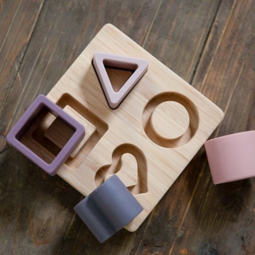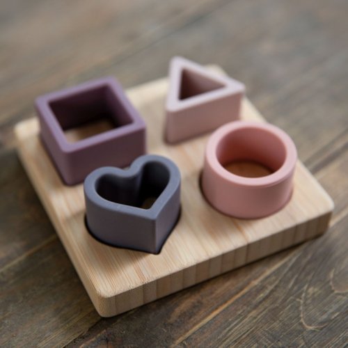 Vkládačka tvořená bambusovou základnou + 4 různými tvary vyrobenými z vysoce kvalitního, na dotek příjemného silikonu.