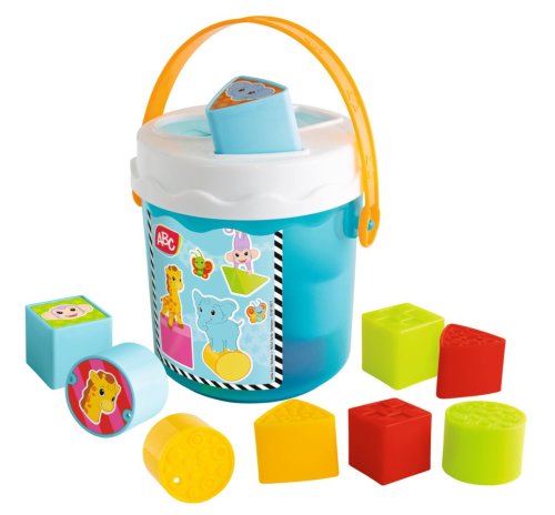 Barevné kostky v kyblíku s víkem se třemi různými otvory pro vkládání dle tvaru, 11 ks, velikost kyblíku 15 cm.