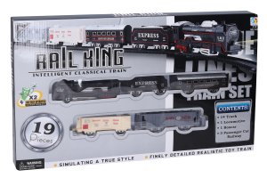 Vlak set. Délka trati 210 cm. Součástí mašinka, 4 vagóny, 4 rovné kolejnice, 10 zahnutých kolejnic. Velikost mašinky 13 cm, vagónů 10-13 cm. 2xAA baterie do mašinky nejsou součástí. Přepínač ON/OFF na pravé straně mašinky.