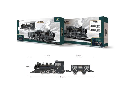Vlak set. Rozměry železnice 75x75 cm, velikost mašinky 19,5 cm, vagónu 15,5 cm. Světelné, zvukové a kouřové efekty. 4xAA baterie do mašinky nejsou součástí. Přepínač ON/OFF na levé straně mašinky. Součástí mašinka, 1 vagón, 6 zahnutých kolejnic, nádobka na vodu. Nádržka na vodu pod stříbrným komínkem.