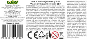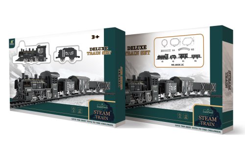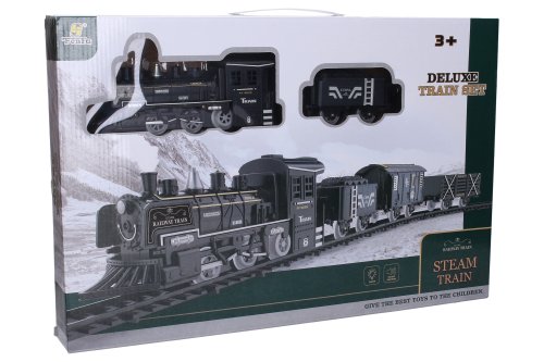 Vlak s kouřovými efekty set s dráhou 125x105 cm. Vlak vydává zvukové, a kouřové efekty. Voda se nalévá do nádržky pod stříbrným komínem. ON/OFF spínač na levém boku. 3 způsoby složení trati: 75x75 cm 105x75 cm 125x105 cm Návod na výměnu baterií, propojení vagónů a doplnění vody se nachází na obalu. Baterie 4xAA, nejsou součástí.