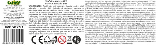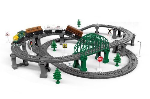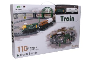 Vlak trať s efekty. Rozměry sestavené trati 77x76x16 cm. Vláček je propojený magnety. Trať vydává zvukové efekty. Aktivace tlačítky na mašince - prostřední tlačítko ON/OFF, směrová tlačítka pro jízdu v daném směru. Část trati aktivuje zvukové efekty, 1x3V CR2032 baterie jsou součástí. Vláček - 2xAAA (1,5V), nejsou součástí. Sada se skládá z 110 dílků.