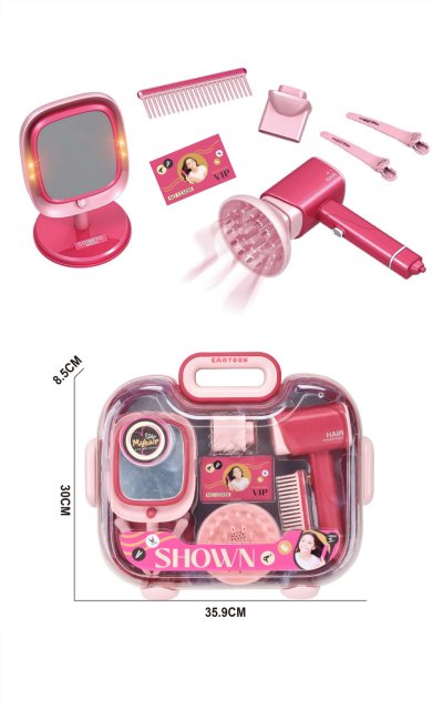 Vlasové studio fén + zrcadlo představuje kompletní sadu pro malé parádnice, které si chtějí hrát na kadeřnici a rozvíjet svou kreativitu. Tento set obsahuje deset dílů, mezi nimiž najdete růžový fén s difuzérem, který má realistické světelné a zvukové efekty, díky nimž působí jako opravdové salonní zařízení.
