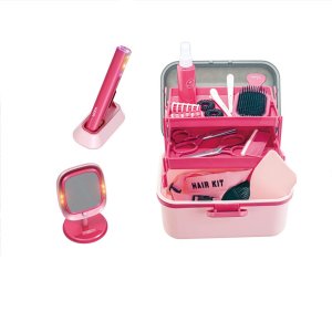 Set je uložen v praktickém růžovém kufříku s držadlem, který usnadňuje přenášení a zároveň slouží jako úložný prostor pro všechny doplňky. Kufřík je vybaven rozkládacími přihrádkami, ve kterých jsou pečlivě uspořádány různé kadeřnické nástroje včetně hřebenů, kartáčů, nůžek, spon a spreje. Každý prvek je zhotoven z plastu a navržen tak, aby byl bezpečný pro děti od tří let a zároveň podporoval rozvoj kreativity a představivosti při hraní.