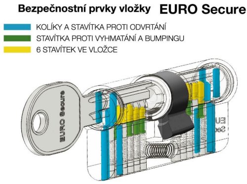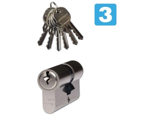 Certifikováno v bezpečnostní třídě RC3 dle ČSN EN 1627:2012. Certifikát NBÚ typ 2 SS4=2. Bezpečnostní 6stavítková vložka s odolností proti odvrtání a nedestruktivní dynamické metodě (tzv. bumping). Ochrana proti odvrtání pomocí 6ti prvků z kalené oceli. Tvoří ji 5 kolíků a 1 stavítko. Možnost společného uzávěru - „SU“ - cena, viz Katalog dílů. 40.000 reálných kombinací klíče. Materiál vložky a klíčů: mosaz Povrchová úprava: matný nikl (NI) Volně kopírovatelný klíč. Balení obsahuje: 6 ks prodloužených klíčů, 2 ks šroubů 50 + 60 mm, identifikační kartu. Standardně jsou vložky baleny v krabičce. Možno také objednat v transparentním blistru + á 7,- Kč/ks.
