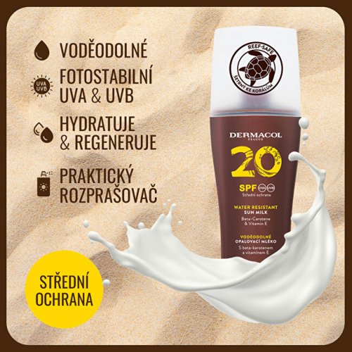 Opalovací mléko SPF 20, spray se příjemně a lehce aplikuje, chrání pokožku, dokonale ji zvláčňuje a hydratuje, zabraňuje poškození a předčasnému stárnutí pokožky vlivem UV záření.