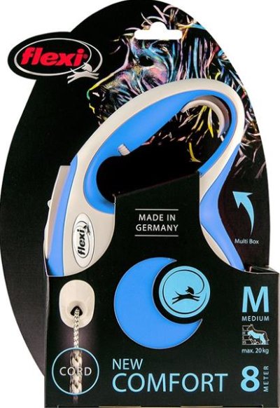 Dokonale navržené dvoubarevné vodítko Vás upoutá na první pohled. New Comfort nabízí všechny funkce, které potřebujete a proto si ho brzy zamilujete! Vylepšený brzdový systém s krátkým zdvihem umožňuje více kontroly, ergonomické držadlo je nastavitelné dle velikosti ruky (od velikosti M). Lze přidat i Multi Box pro ukládání pamlsků či sáčků (od velikosti S). Rodinná firma flexi vyrábí výhradně na území Německa. V závodě v Bargteheide u Hamburgu vzniká vše, počínaje návrhem až po výrobu vysoce kvalitních vodítek – Made in Germany. Firma flexi je vynálezcem samonavíjecího vodítka a jedničkou na světovém trhu, exportuje do více než 90 zemí světa. Originální samonavíjecí vodítka flexi se vyznačují patentovaným, po technické stránce nejmodernějším pružinovým systémem a komfortním ovládáním. Jsou vyráběna z vysoce kvalitních materiálů, exkluzivně manuálně zpracovaná a sestavená. Vodítka prochází před expedicí mnoha kontrolami kvality. Velikost: M – vhodné pro psy o hmotnosti do 20 kg. Typ vodítka: Navíjecí – lanko. Délka pásku/lanka: 8 m Barva: modrá